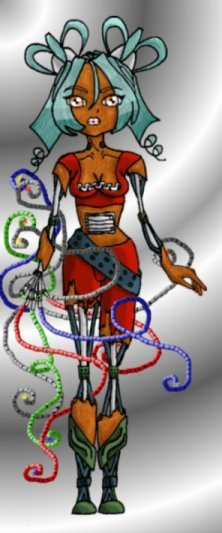 Wow. Great coloring, especially on that shiny red hair, the soft skin and the background. Her face is also well drawn, and the look seems very appropriate for an android. However, her arms and shoulders could use some work. The shoulders look too straight, when they should be more of a gradual curve downwards. As for the arms, I think that they look too short; a good rule of thumb for arm proportions is to make the distance from shoulder to navel be the same as from shoulder to elbow, and then make the forearm as long as the upper arm, using that reference. Also, both forearms should be foreshortened a bit to look bigger; because they're both on her body, they're closer to the viewer.