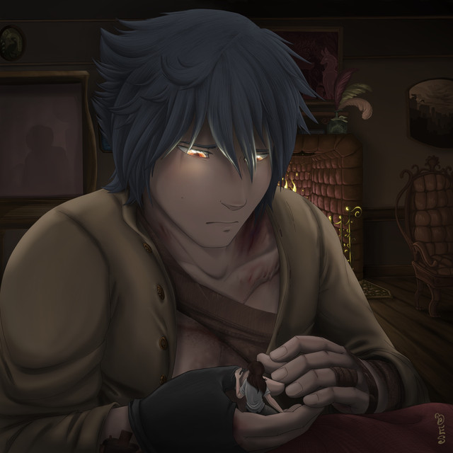 “Hmph.” He took a moment to vent out his distress before complying with her instructions and pulling his body to the right. Now they were eye to eye, as close as they could be without pushing away from one another in awkward reflex. The dark crimson color in his watchful eyes so fittingly matched the sinister attitude he displayed; her heart couldn’t take looking at it a moment longer, instead jumping down to the surface of his shoulder to avoid it.