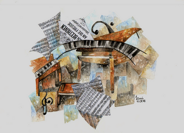 Brilliant, I like this a lot. What it tells me is how a close relation ship between a father and son can be separated by the turmoil of other people. I see the father and the son's chair in their own space and the textures around them, along with the colours, suggest chaos around them. It seems it has pushed them both into their own bubbles away from each other. I love this simple way you have displayed one being the father and one the son, just by size!