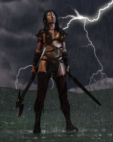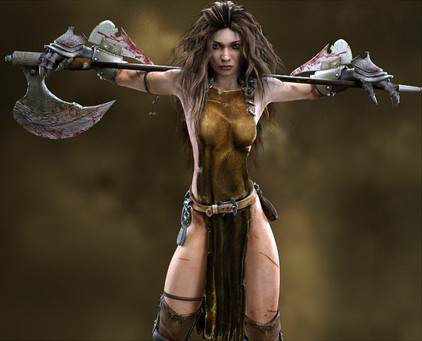 Ooh. Now THIS, I love. The fabrics, the textures, the tats... The only thing is that the axes look too big for a woman with that musculature to actually hold in such a manner (at least for long).