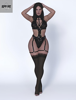 This render is one of two test runs to check if the harness set looks good in action. The model seen here is one of my personal favorites, I removed her tattoos for the time being since I am reworking those, but she is G3F Karen (I didn't name her) 7 base updated for a G8F female with custom maps. It's a simple scene with a studio plane and a HDRI, with the model and the new outfit in question.