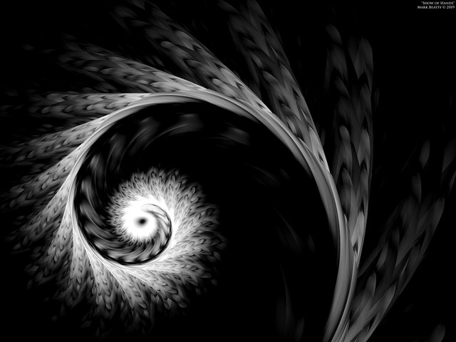 I'm impressed by this black and white strings... looks like a snail shell of silk-feathers and a spider's web rotating as well...