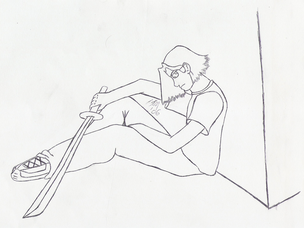 No clue what I should really call it but I just thought of drawing me sitting solemnly against a wall with a sword resting either forwards or to the side (guess which way I went). Anyway, I drew it and then did something I have literally NEVER done before and anyone who is a long time watcher of my gallery will back me up on this one. I inked it....It's for this fact that I request you be lenient if you have something bad to say about it. 3 things I know are bad about it though....the right arm looks like it's coming from too low. The sword looks kinda wobbly along the blade (next time I draw a sword it'll be with a ruler) and the right knee looks strange because you can't see the top of it and it looks like a few sprouting lines into a void....just think of it as shaded. I invite...nay, I request someone colour this. I have nothing to offer you bar a request picture of almost anything (excludes nudity, realism and abstract art..I hate abstract art). I think I've wasted enough of your time....I'll be going now.Related content