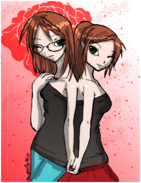 My half of an art trade with . She wanted a red eyed girl with brown hair, and since I didn't really know what she would like, I figured I'd draw 2 girls so hopefully she'll like one of them. She didn't give me much direction for how to design them, just to have them transitioning from gothic to modern (which I have no idea what that would look like).So I did one kind of more modern, and the other a little more goth. I hope you like it Loaf!