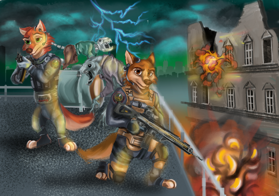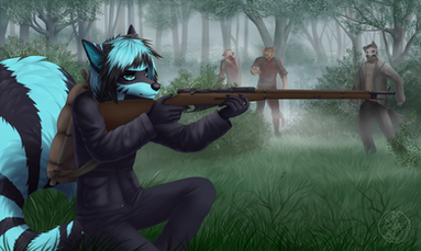 From left to right, top to bottom: Veritas the cinnamon bear is Finn from Adventure Time, Megellin the arctic fox is a modern twist on the Grim Reaper, Katakeome the red fox is a Sniper from Team Fortress 2, and McKaela the maned fennec is a Witch from Left 4 Dead.