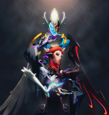 thank you dall-e for emboldening my hero fusion brainworms!because *obviously* i ran them all through the AI image generator (the Panacea and Genesis ones were considerably less interesting because Mercy is a horrible attention monopolist and so all the images just look like her in different colors)