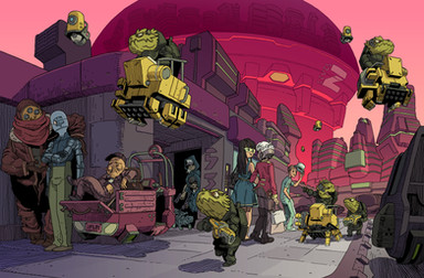 Reminds me of the work of Brandon Graham. Very nicely done.