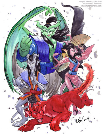 One of my favourite fan arts still, this features Iago, Othello and Desdemona in their bot forms as Coldsteel, Coldstone and Coldfire surrounding the strange moon of Coldstone's programing.Assorted markers and white charcoal pencil, 2002. First place Canon Color at Gathering 2002.
