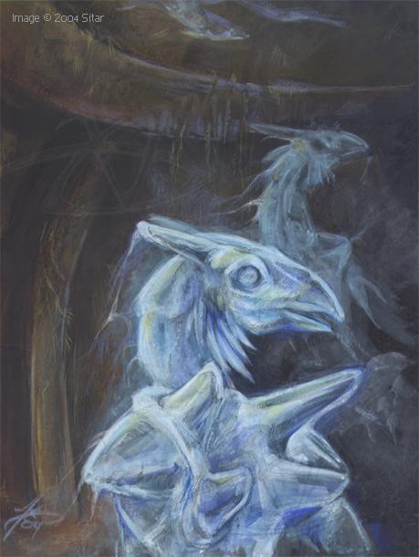 Long-furred ghost can't even see his reflection from bright crystal wall... No reflection nor eyes. :<This miserable spectre appears sometimes in areas he once lived - by nights, classically - howling and whining silently. He vanish into air if somebody tries catch him, but often disturber just runs away in fear. Bloodweeper's hollow eyes and eerie appearance easily scare common mortals in darkness, but he is harmless and weeps blood because those don't like him...