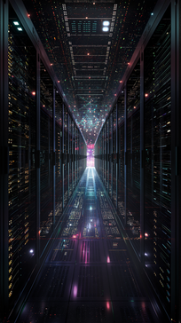 A spacious server room with rows of dark colored servers of various sizes, creating an imposing and organized appearance. Iridescent blue lights reflect off surfaces, giving the room a cool A spacious server room, filled with numerous computer servers largely occupied by dark colored, black, computer servers. These servers are lined up in rows spanning from the floor to the ceiling, creating an imposing visual. The servers are placed closely together, creating a dense and organized appearance. The servers are of various sizes and are positioned throughout the room, showcasing a well equipped data center Iridescent shades of blue emanate from lights within the room, reflecting off the server surfaces and seemingly illuminating the room with a cool, mysterious glow.After you have bought an artwork write me a deviantart message with the ID below. After that you will receive the height resolution artwork without watermarks.