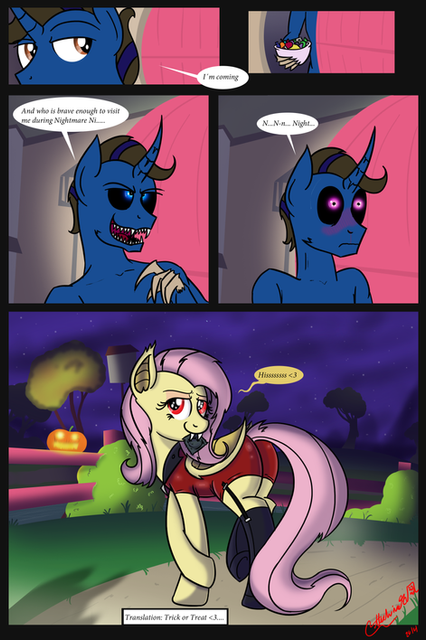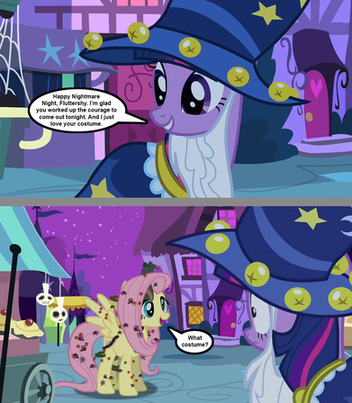 Woona: I still think this costume is too spooky...Now before you all rant "Equestria doesn't have a Halloween, it's Nightmare Night, stupid" remember that Nightmare Night only exists because Nightmare Moon was sent to the moon and then they created a holiday. Since Luna is still around and has yet to become Nightmare Moon, there is no Nightmare Night, so I needed to use Halloween (stupid).