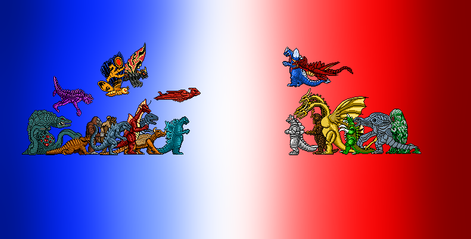 Another request,this time of a friend of mine,after his words:I want something big,like in a desert and with a LOT of monsters,he telled me what monsters he wanted,what position and what colors he wanted.Gigan by Linkzilla,Geon by Zombozo,NOTE:My friend viewed my gaira,sanda and jet jaguar drawnings and wanted them in the picture,he looked for them and he downloaded and sended them to me,if someone tells me the name of the guy whow did them i will give credit