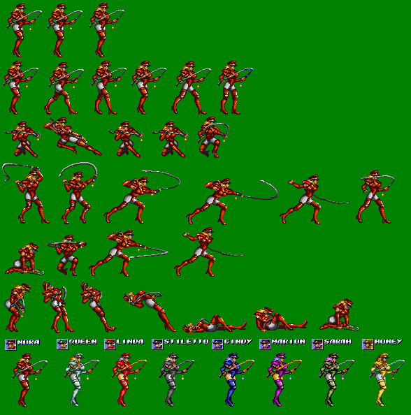 I would kill for a sprite sheet of the She-Devil of the Coloseum (the Stage 5 boss) from the 1993 Konami arcade beat-'em-up, Metamorphic Force. Also (or alternatively), a sprite sheet of Racheal from the 1993 Konami arcade fighting game, Martial Champion.