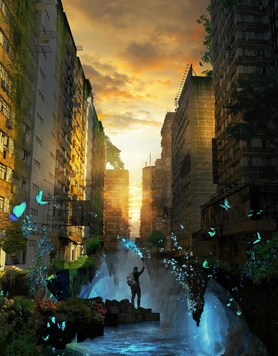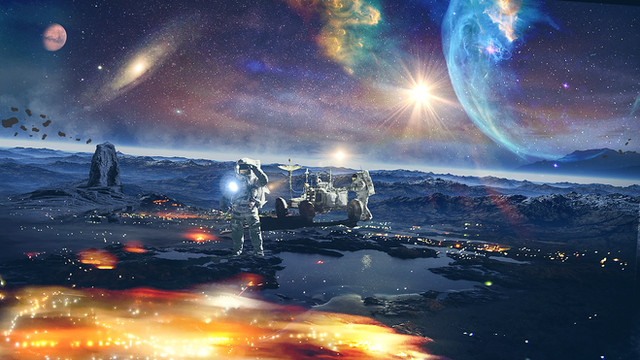There's so much to see in this one...the distant lighted cities, the horizon, the mountains, the space, the lighted alien plants, the astronaut...it all comes together extremely well. Bravo!