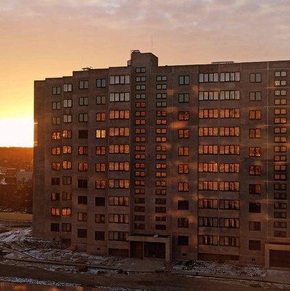 Reykjavík (Iceland), Sæbraut.The sun about to set. Although the sun drifts very slowly towards the West at these latitudes, about 60° North, it is nevertheless a matter of seconds to catch such a reflexion perpendicularly to the façade.