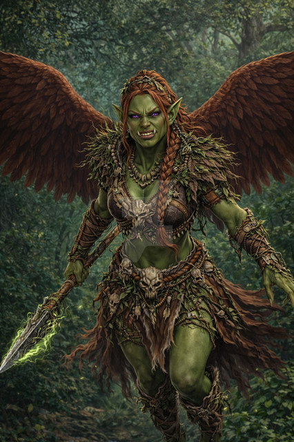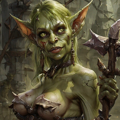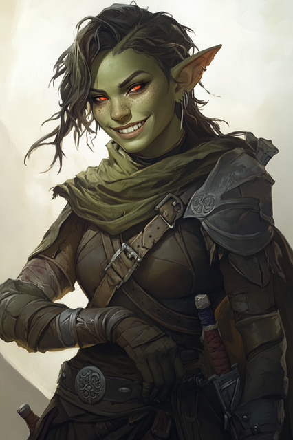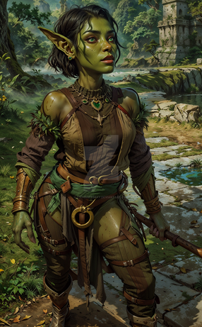 Physical Appearance: Sezz has green skin, a common trait among goblins. However, her blonde hair sets her apart from the rest of her tribe. She has sharp features and piercing green eyes. She is of average height but has a strong and athletic build from years of scavenging and leading her tribe.
