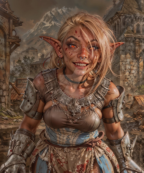 Background: Sezz was born into a human village on the outskirts of a human kingdom. Her mother was a goblin and her father was a human, making her a half-breed. Growing up, Sezz faced discrimination from both goblins and humans, but she used her intelligence and strength to rise above it. She learned how to scavenge and sell scrap, becoming a valuable asset to her tribe. She also Β acted as a mediator between the humans and the goblins of her tribe. She slowly made a name for herself on the fringes of the human kingdom. And eventually became known as a suitable trading partner. Other goblins, as well as humans, heard the stories of her tribe. Some goblins from remote lands had set out to join her. People from other regions wanted to trade with her.