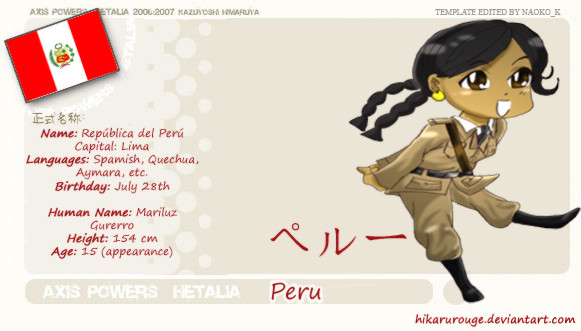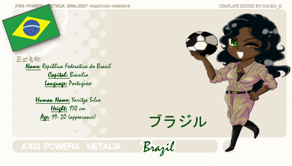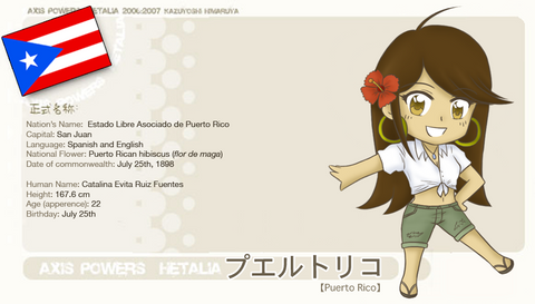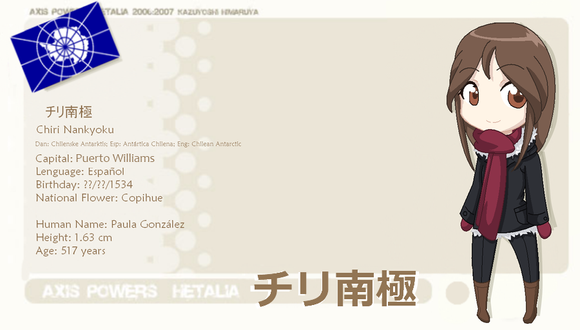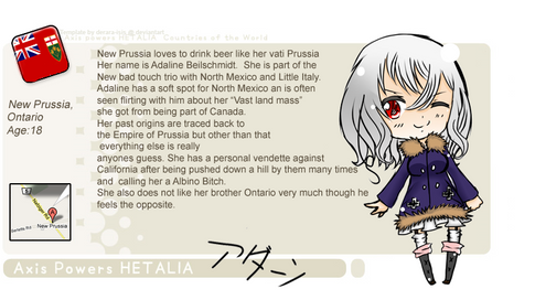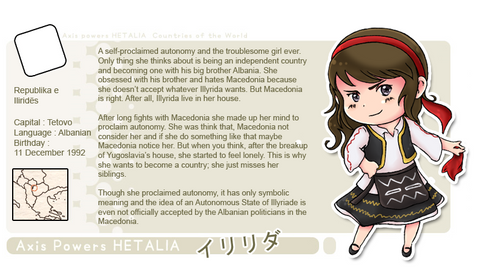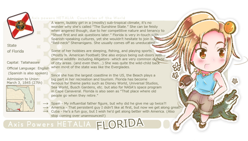 Self proclaimed Older Sister figure to America and Canada, as she was the one who taught America to be tough while England was in Europe, which was sort of he fault that America has that whole 'I'm the Hero' Attitude, (you know, America, Home of the Brave, Native Americans being strong Brave group of people... yeah... figured you'd catch my drift). She was, however, a bit easier on Canada, thus making her one of the few people that remembers Canada's existence.....