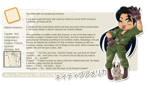 P.S. sorry if i messed up on the uniform, I mean seriously, what does the US uniform look like when America is not earing his bomber jacket!? Also, the Native Nation has various flags to represent each tribe, so I just made something up and useda commonly seen symbol seen in Native Culture (Gosh... I am not a very good Native to have to do research on all this... OTL :epicfail: