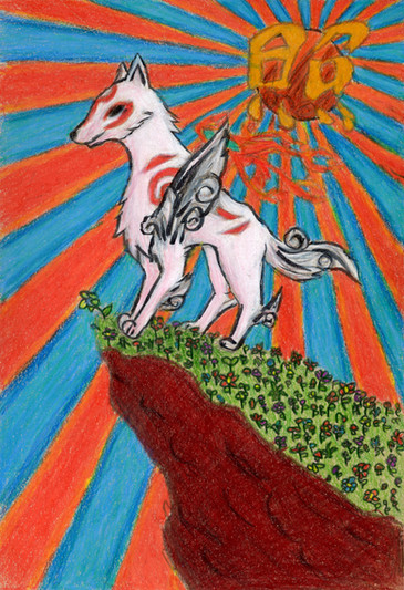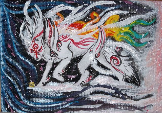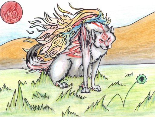 #acrylicpaint #coloredpencil #colorful #fantasy #gamefanart #okami #planets #swirls #tsukuyomi #wolves #okamiamaterasu #okamiwolf