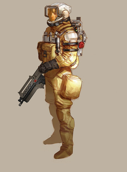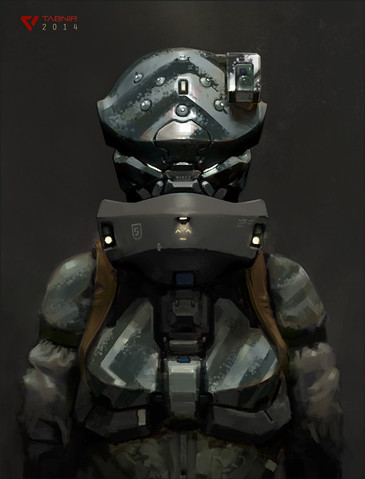 #104URSYN cyborg sniper. Heart and lungs can be switched over to the artificial heartlung machine in the 'suitcase' to completely avoid breathing movements during sniper ops. All air exchange is dispersed through baffled vents spread throughout the suit chestplate in order to minimize heat signature. Helmet has extensive support for uplinking and features integrated spotter functionality.