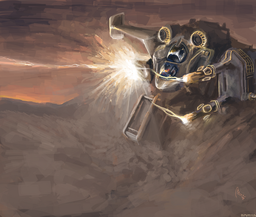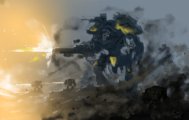 The mech's utility arms [3 per side] unfurl to perform various tasks such as righting and tick-infantry removal. In their collapsed position they may swing around and act as shielding. This particular class of mech has two modular weapon hardpoints on its back; these hardpoints operate like arms to allow both turrets to concentrate fire on any target. The nearer mech's starboard hardpoint seems empty because it has deployed its independently-operating aerial pallet drone.