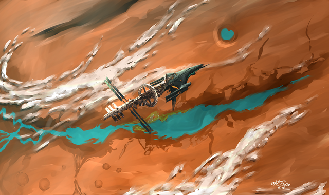 The 盘古[Pan Gu] was the second of the massive Gaia-class terraforming 'ark' ships used for extremely long-range colonization. Gaia-class ships carry their own fleets of mining and escort vessels along with their respective automated fabrication plants. The aft section of the ship is dedicated to manufacturing of colonial cities [orange boxes] which would be dropped off at appropriate sites and unfold, ready to be inhabited. Forward "fingers" are bristling with earth-moving equipment, but also contain science facilities for seeding fauna and flora. Once the colony has been fully established, the vessel powers down permanently to become part of the landscape.Draft started out as an art duel, topic being 'giant terraforming robot.'