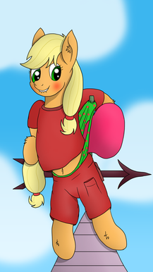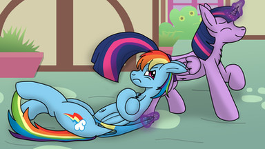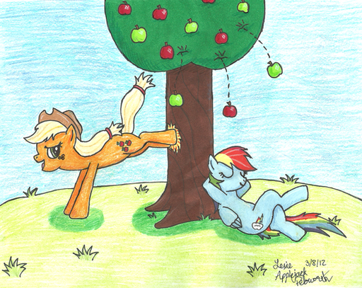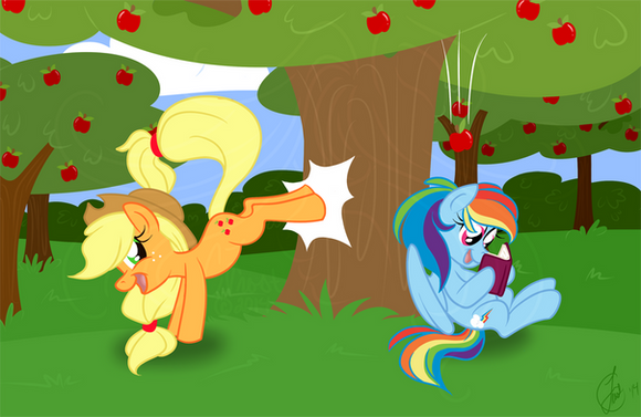 One of Dash's favorite places to take a nap was on a tree branch on one of the many trees on AJ's farm. After spending a lot of the morning being lazy, the mare decided to take a nap and flew over to AJ's farm and took up roost on a branch before drifting off to sleep to dream wonderful dreams. Applejack on the other hand was a work horse and spent most of her day tending to her farm. She didn't like Dash napping in her trees because seeing her reminded her of what she wanted to be doing rather than working. She had asked Dash nicely to not nap in her trees when she was working as to not distract her so she could focus on her work.Applejack came across Dash sleeping on the branch of one of her apple trees. "Dam it, Dash!" she thought to herself as she spotted the blue pegasus. After realizing asking her again to not nap around her farm she would have to be more physical with Dash to get her to stop napping about. She stood thinking about what she could do when she came up with an idea. She trotted off and got her trusty rope and returned to the tree that Dash was sleeping in. She took aim at the pegasus and lassoed the pegasus's blue panties, yanking on them and pulling sleeping mare off of her perch, waking Dash up.