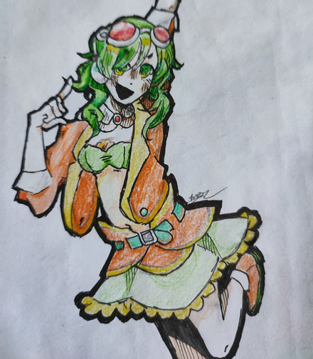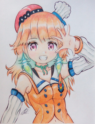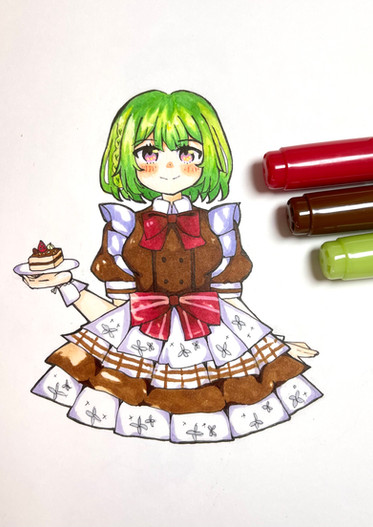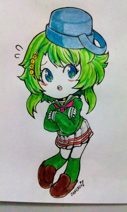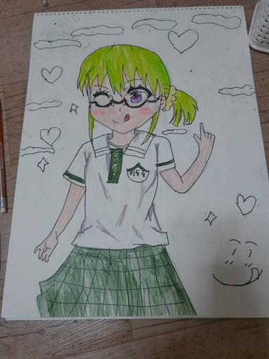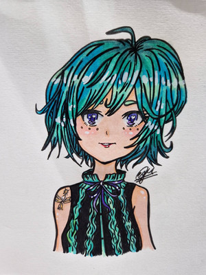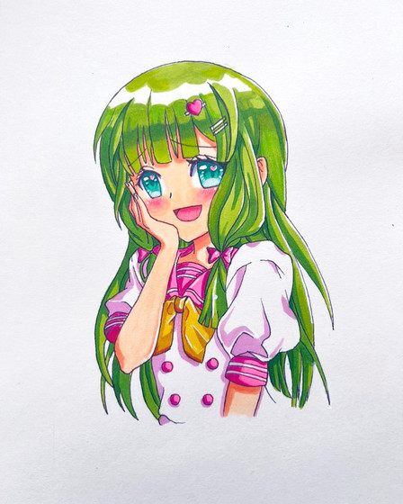 #animedrawing #animegirl #chibistyle #colouring #crossedarms #cutegirl #greenhairedgirl #hairclip #prettygirl #traditionaldrawing #shorthairgirl #showingbelly #greeeneyedgirl