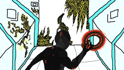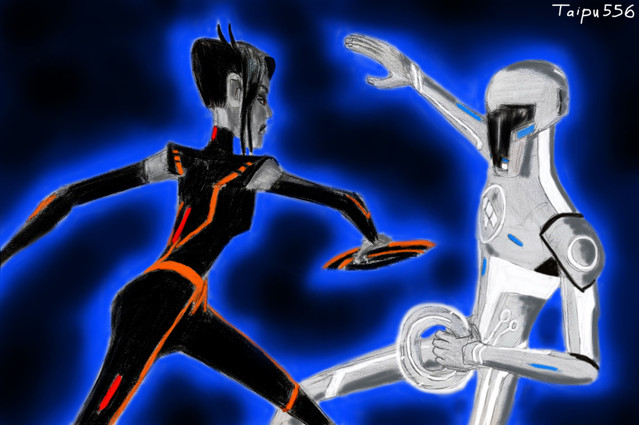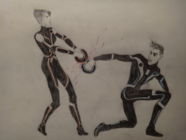 this was just something I was thinking about how Tron punches through a black guard with his identity disk [link] only this is with a black guard doing it to a random programI drew the derezzing program to look like one of those criminal programs in Purgos with asymmetrical circuitry.