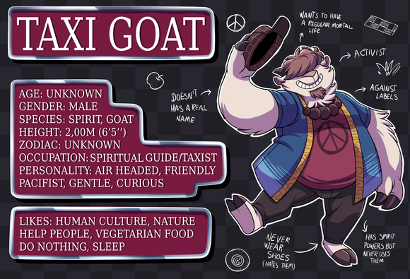 I sadly passed half of the week sick and in bed, so I didn’t draw much stuff in these last days. But I finally completed this piece! I always wanted to make a reference sheet of one of my characters. I chose the Taxi Goat cuz he seemed fun to make, but maybe I’ll do more about other chars in the future!