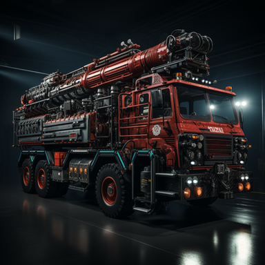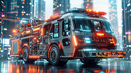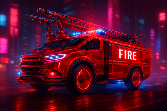 Neon style fire truck is an incredibly eye-catching vehicle. The entire body of the vehicle is painted in bright neon green, which makes it visible even at night. On the side of the vehicle is the emblem of the fire department in a bright neon orange.The headlights of the fire truck are outlined with bright blue neon lights, while the warning lights on the roof of the vehicle flash in different colors. The lights alternate between bright red, yellow, and green to give an eye-catching and recognizable warning.