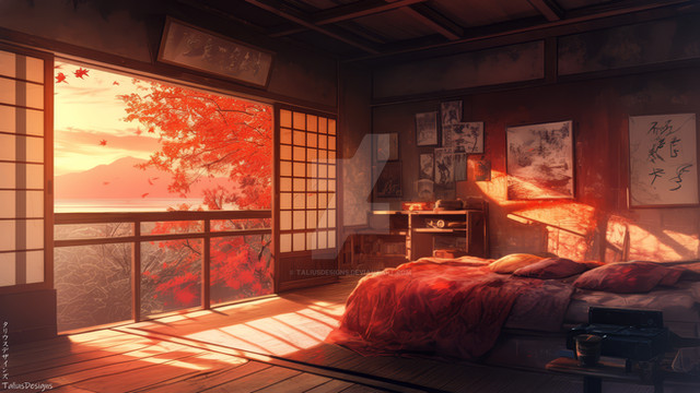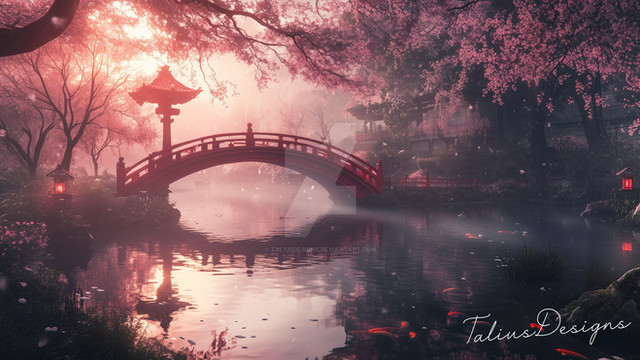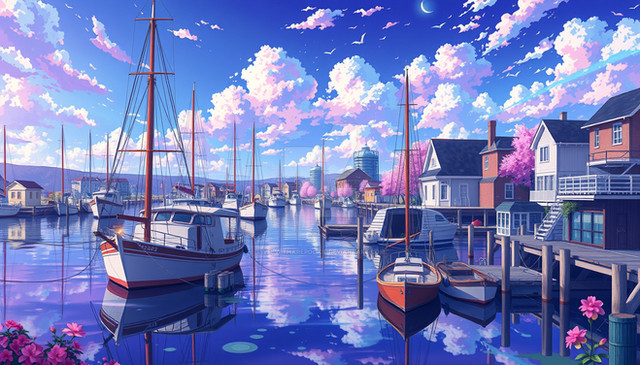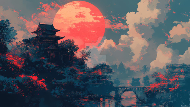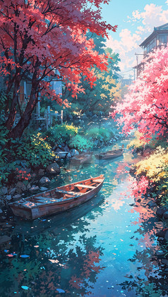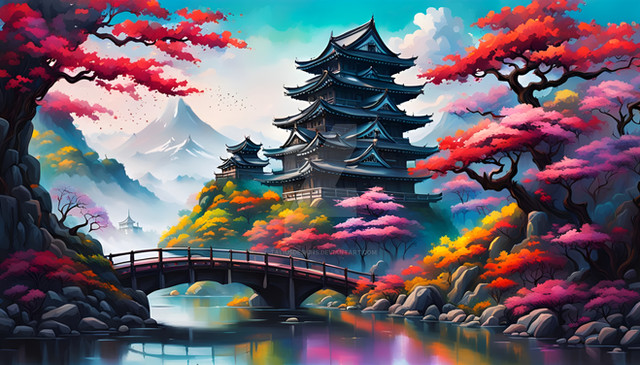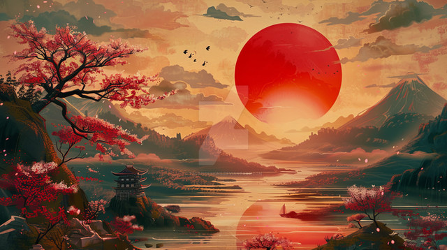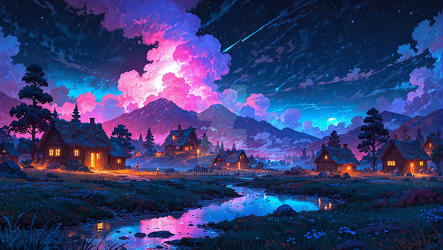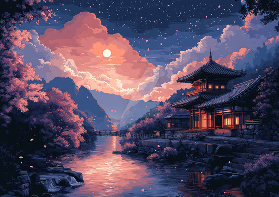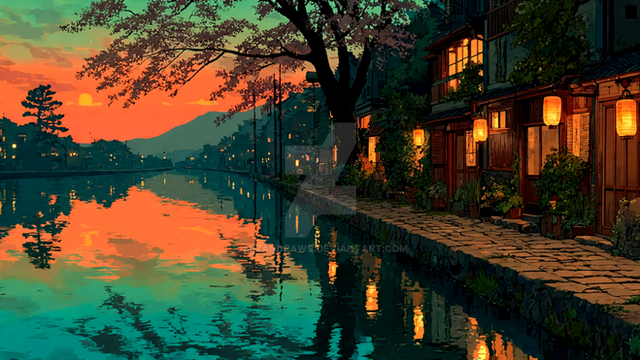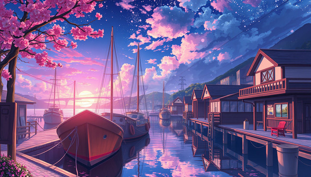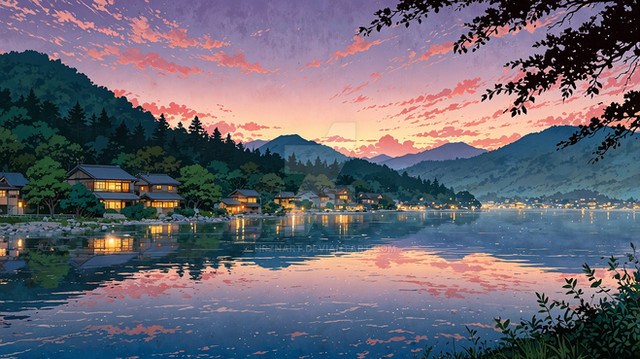 "Lakeside Reverie" captures a serene lakeside village at dusk, bathed in the vibrant pinks and purples of a sunset reflected in tranquil waters. The scene showcases traditional Japanese houses nestled among flourishing cherry blossoms and fiery autumn leaves, creating a harmonious blend of color and calm. This artwork beautifully portrays the tranquil beauty of nature, offering a moment of peace and reflection in a picturesque setting.Premium 4K Wallpaper