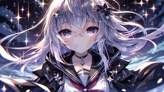 In a quiet interlude under the infinity of night, a girl with strands of moonlight woven into her hair gazes at the heavens. Her eyes, deep as the ocean, are flecked with stardust, reflecting the boundless dreams of the cosmos. A single, wistful tear traces a silent path down her cheek, an embodiment of the beauty and sorrow interlaced within the human soul, ever longing for the stars it cannot reach.Premium Wallpaper