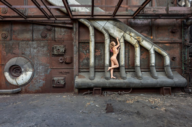 Whoa....you're looking far too deeply. There are certainly no metaphors in any of my work. I hope it has some sort of depth but I don't use the juxtapostion of objects to send some specific message. In the broadest sense my nudes series is part a self exploration and part expression of my feelings towards women and the female form. In this particular case I loved the textures: the wall, the radiator and floor and I especially liked the light coming in from the right as it does. I decided to shoot the model in this space. I like the incongruity of the naked form in this environment but that's as far as it goes. Having said that though the viewer brings their own life experiences and is free to interpret a work of art in any way they want. It's what it says to you and all those things that you said are very insightful and if that's what you see then maybe that's what it means.