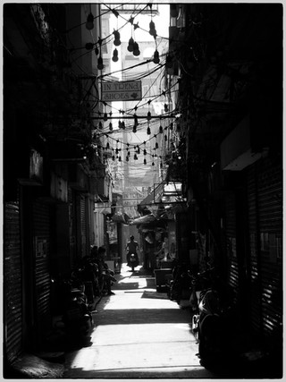 I love how the motorbike lights and the lightbulbs glow like fireflies, and the slanting sunlight...it seems there is a lot of light, but the people and shops are still so dark, it's mysterious