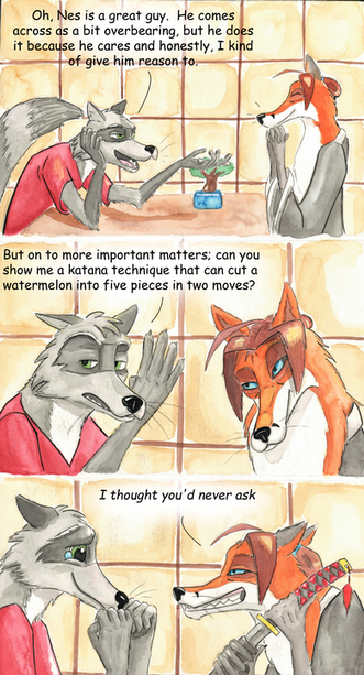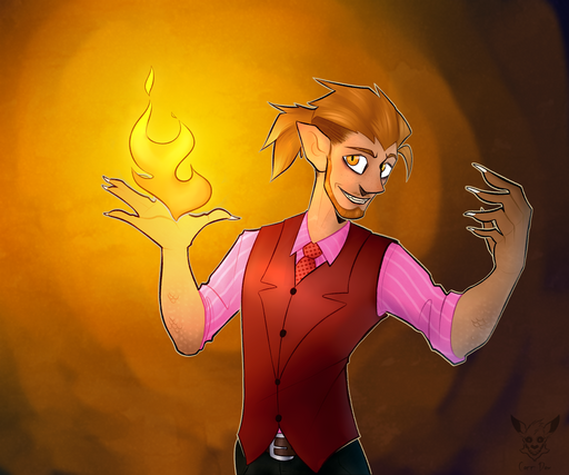 Man, I keep forgetting to upload stuff here.A slightly belated gift drawing for TEK427 featuring Pyromancer Payter from his story, Luminaris, teaching Ferox how to make his legendary pyromancy-infused hot cocoa.