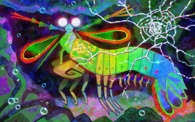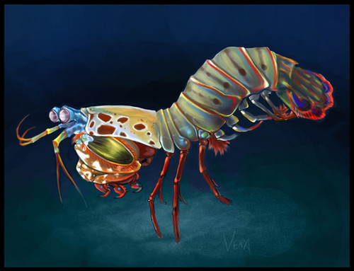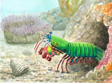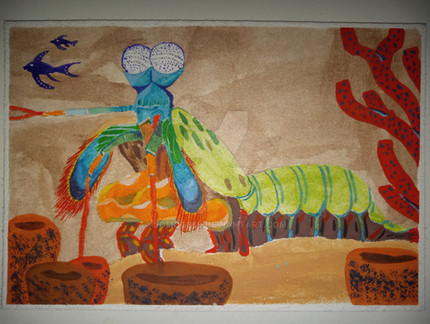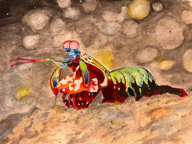 So, the other day I happened upon a piece of paper with what initially appeared to be a hideous stain upon it, but further inspection proved it to be one of my earliest attempts at watercolour from some five years ago. After the seizures stopped and my eyes stopped watering I resolved to do something about. Namely do it again!So here is one of the most badass and ill-tempered invertebrates undar da shea, a mantis shrimp!