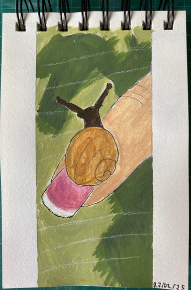 A colored pencil drawing of a snail on the tip of a finger. My dad was the one that found the snail,, and it was the smallest snail I had ever seen.Related content