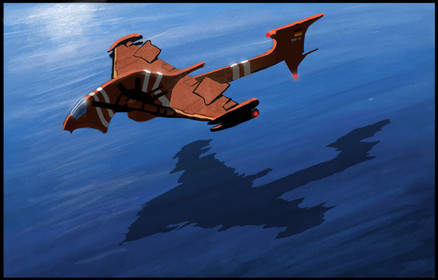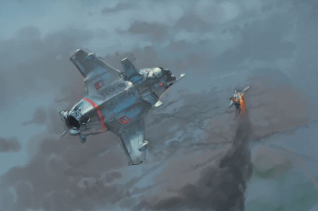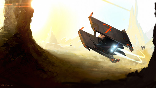 Fantastic sense of motion and awestruck in this piece. From the planetoid in the backdrop poking over the horizon to the flash and neon effect of the imposing ship to the streak line of the fighter challenging it. All around, brilliant execution.