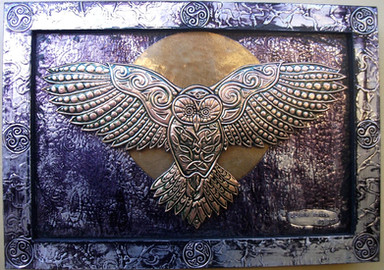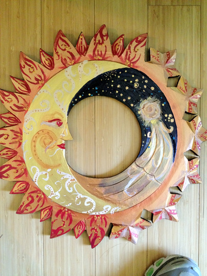 This is spectacular. I love the symmetry of it, and how graceful the point of the two wing feathers at the top is. Something about it is just really marvelous to look at - I also love the spiral in the middle of the sun. And the branch-things he's holding. And the detail of the feathers is amazing.