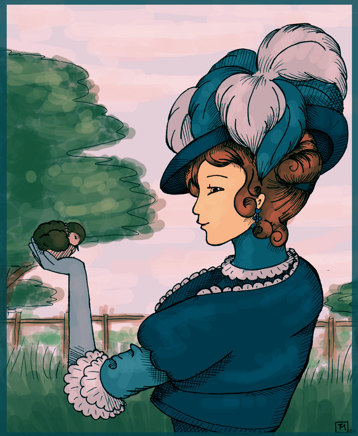Гм. Над фоном может быть действительно стоило ещё поработать, но не суть. Девушка очаровательна. Очень нравится её выражение лица, её маленький изящный носик и улыбка. И ещё - она идивидуальна, красива по-своему и на неё не распространяются обычные для многих каноны бездушной красоты (блин, я раучилась нормально разговаривать, прости ). Радует шляпа и птичка. И причёска. Такой элегантный пучок и выглядит очень естественно. Не слушай никого, главное в рисовании - это практика. Знание анатомии, техники и прочего занудства придёт со временем.