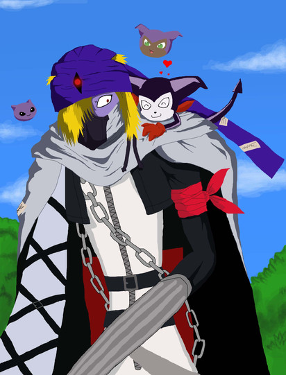 I mainly made this for myself as I don't currently have any new interesting, fun games to play and go crazy for at the moment. lol I decided to go ahead and start watching through the Digimon Tamers collection I got ages ago from Amazon and despite how cheesy it was, it still has it's charm and great story line. It made me miss how cool everything used to be when I was younger and I'm still very fond of Digimon. Beelzemon (or Impmon- same guy) was and still is my favorite due to his story. You can have ALL things you've ever wanted to have but not what you need.I gave Beelzemon my blue eyes because I see a lot myself in his character and I know, Beelzemon had dark powers but I liked Impmon's Badaboom damn it. In Beelzemon's right hand is an actual 'Beelzemon' Pendulum edition that released not too long ago. I'm still waiting on my Pendulum X from Japan for next month. The background I based on Mount Infinity from Digimon World on the Playstation 1.