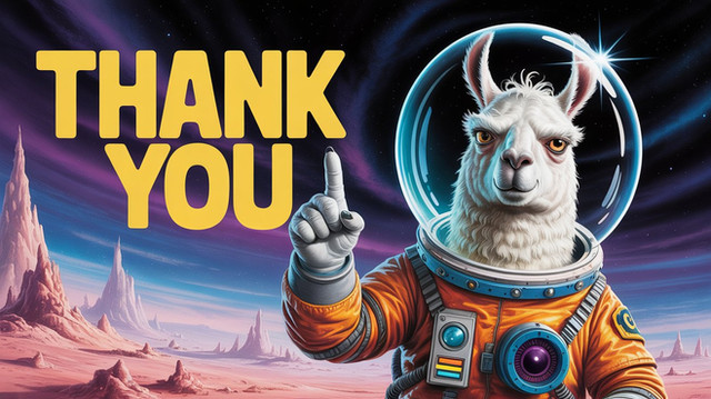 create a image, sci-fi style, cinematic style, metallic, neon, Masculine style, 1980's retro style, 1980's vintage style movie poster style, poster centered, poster focused, card that reads "THANKS FOR THE LLAMA AND WATCHING HAVE A WONDERFUL DAY"