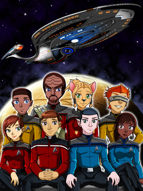 Sort of a promo shot for "NCC", a sort of nebulous collection of Star Trek stories cobbled together by my friend and I. Still don't quite have a main plot thread or anything, but the characters are starting to come together.Here we have some of the bridge crew of the USS Saipan, NCC-68258. Captain Li Wong, First Officer Lt. Commander Viladi, Operations Officer Lieutenant T'Shaara, and Chief Medical Officer, Commander Vael, in around 2358. Clearly Vael is standing on a box for this one.