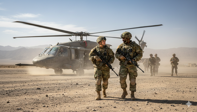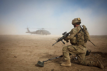 20th Infantry Regiment, 3rd Stryker Brigade Combat Team, 2nd Infantry Division, walk toward a UH-60