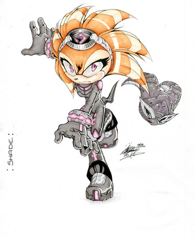 Fantastic work on Shade x) I am happy to see that your experiments with SAI are going so well <3 Somehow I like the specific working together of the outlines with the colouring here <3 While the outlines are thin and still pretty strong, suiting to Shade's pose and facial expression, the colouring yet again is pretty soft <3 You are able to show many different materials already without strong changes, the metallic effect is coming to show nicely, while my personal favourite parts are the glowing pink parts of her armour C: Not only do they make a good light source, but they also show a great plasticity Seeing the light influence on Shade it makes me think of my fav level of the game she was in again <3 Seeing how good the characters turn out already, I am excited how the main motifs will work together with an entire background in your SAI colouring C: Also yay for friendly, bouncy things in the background XD Once again a great job you did, I am excited for your next projects 8)