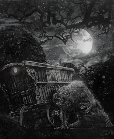 Oh god. I am shamed. The contrast of light to dark, the shading, the motion... this is incredible. Lupine facial anatomy is a bit flat, but that is a werewolf, so eh. The glass is done exceptionally well.