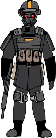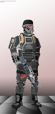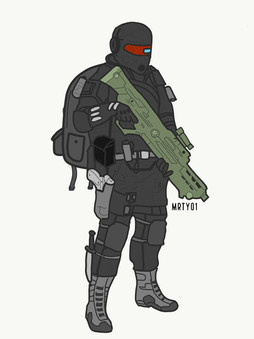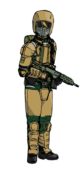 Consists of a Byroceramic hardplate armor piece mounted on a nano-kelvar ballistic vest as well as various Byroceramic hardplate pieces mounted on the shoulder and the knees, the SIBAS-2 or more commonly known as the No.2 remains the standard body armor for many of the IRS's infantry units with its low cost and effectiveness enabling it to be mass produced to equip some 3 trillion military personnel. The armor system is good enough to withstand bullet calibers up to 12.7mm and the Aegis Repellent layers electrolaminated on the Byroceramic armor can deflect lasers and plasma shots effectively and fully protects against shrapnel and flying debris.