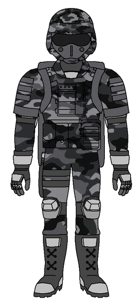 A fully sealed airtight NBC suit that protects the user from nuclear radiation, chemical and biological threats. It has an electronic-controlled chemical reactant that enables the wearer to switch camouflage patterns, allowing its use in multiple environments. Durable, acid and fireproof, the No.3 NBC suit is also comfortable to wear with thermal conductors woven in the suit's layers that dispenses and regulates accumulated body heat to comfortable levels allowing it to be worn in the extreme hot and cold. The fabric of the NBC suit is also thinner and lighter compared to the 21st Century counterparts and a GEN-OPS operator can easily run around in it without feeling hindered by weight or air drag.